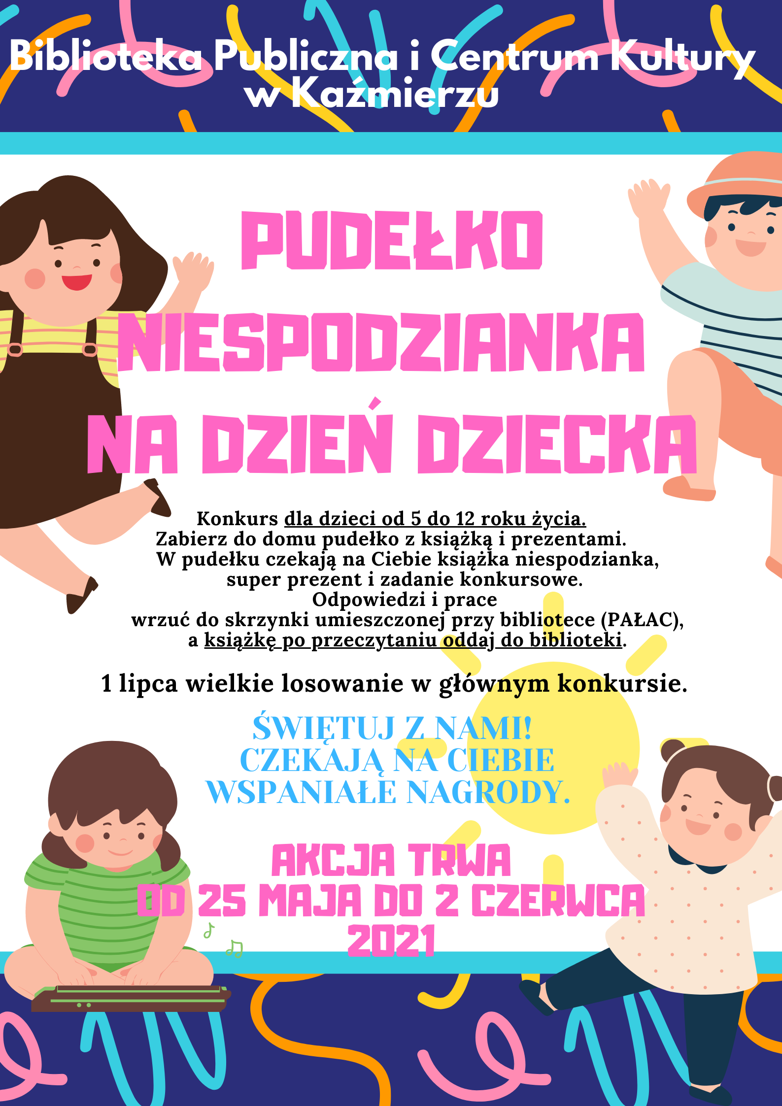 Zapraszamy dzieci w wieku 5 – 12 lat do udziału w konkursie „Pudełko niespodzianka”. W dniach od 25 maja do 2 czerwca dzieci będą mogły zabrać z biblioteki pudełko z książką niespodzianką, prezentem i zadaniem konkursowym.
