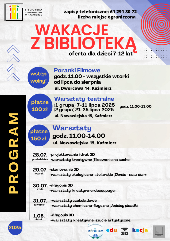 Lato pełne atrakcji, wyobraźni i dobrej zabawy! Zapraszamy dzieci w wieku 7–12 lat na wyjątkowy cykl wakacyjnych wydarzeń – Poranki Filmowe, warsztaty teatralne i kreatywne zajęcia tematyczne.